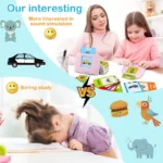 - UČITE SVOJEGA MALČKA BESED Z PONAVLJANJEM – bralni medvedek po vstavitvi kartice izgovori besedo s slike v angleščini, tako da jo otrok ponovi . Če otrok potrebuje ponavljanje, lahko pritisne gumb “PONOVI”. Prav tako lahko utiša ali poveča glasnost bralnika.