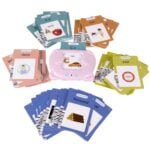 - NA KARTICAH JE BESEDIŠČE IZ OBMOČJA – živali, vozila, hrana, dnevne aktivnosti, družina, barve, oblike, narava, števke, tedni, meseci, letni časi,deli telesa; igrače, zabava, oblačila, instrumenti in še veliko več.